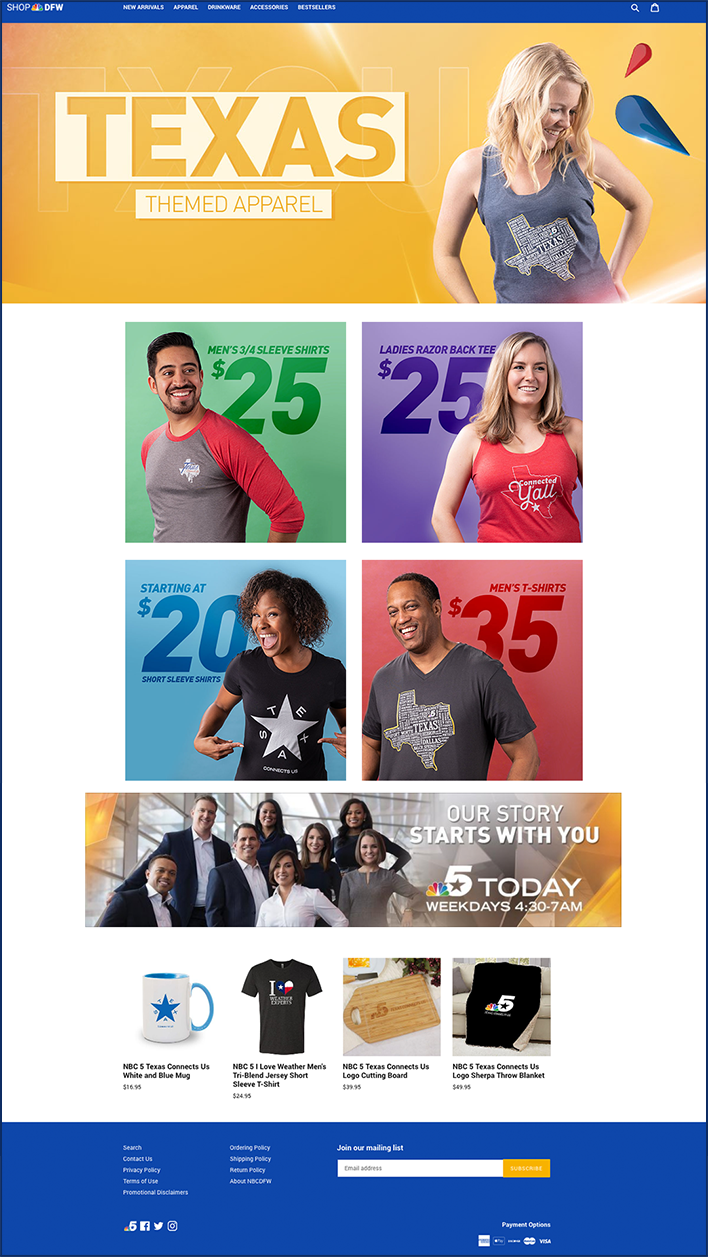 NBC 5 entered the world of e-commerce in 2018 with the ShopNBCDFW online store. This new endeavor launched with a 360° image campaign, touching on print, digital, social, premium, on-air, and activation efforts. This campaign was produced by the NBC 5 marketing team and I personally captained the development of promotional and creative.